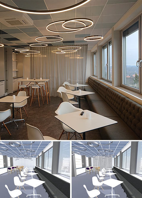 Bei der Decke entschied man sich bewusst für die einfache hausübliche Rasterkonstruktion um bei Bedarf problemlos wieder Büroarbeitsplätze einrichten zu können.