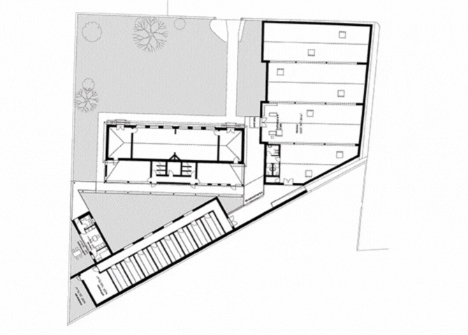 Das Museum mit ca. 600 m² Fläche füllt die Hanglage entlang der beiden Straßen aus. Die versetzt angeordneten, langgestreckten Baukörper mit Walmdächern interpretieren Elemente der traditionellen portugiesischen Architektur aus Landwirtschaft und früher Industrialisierung.